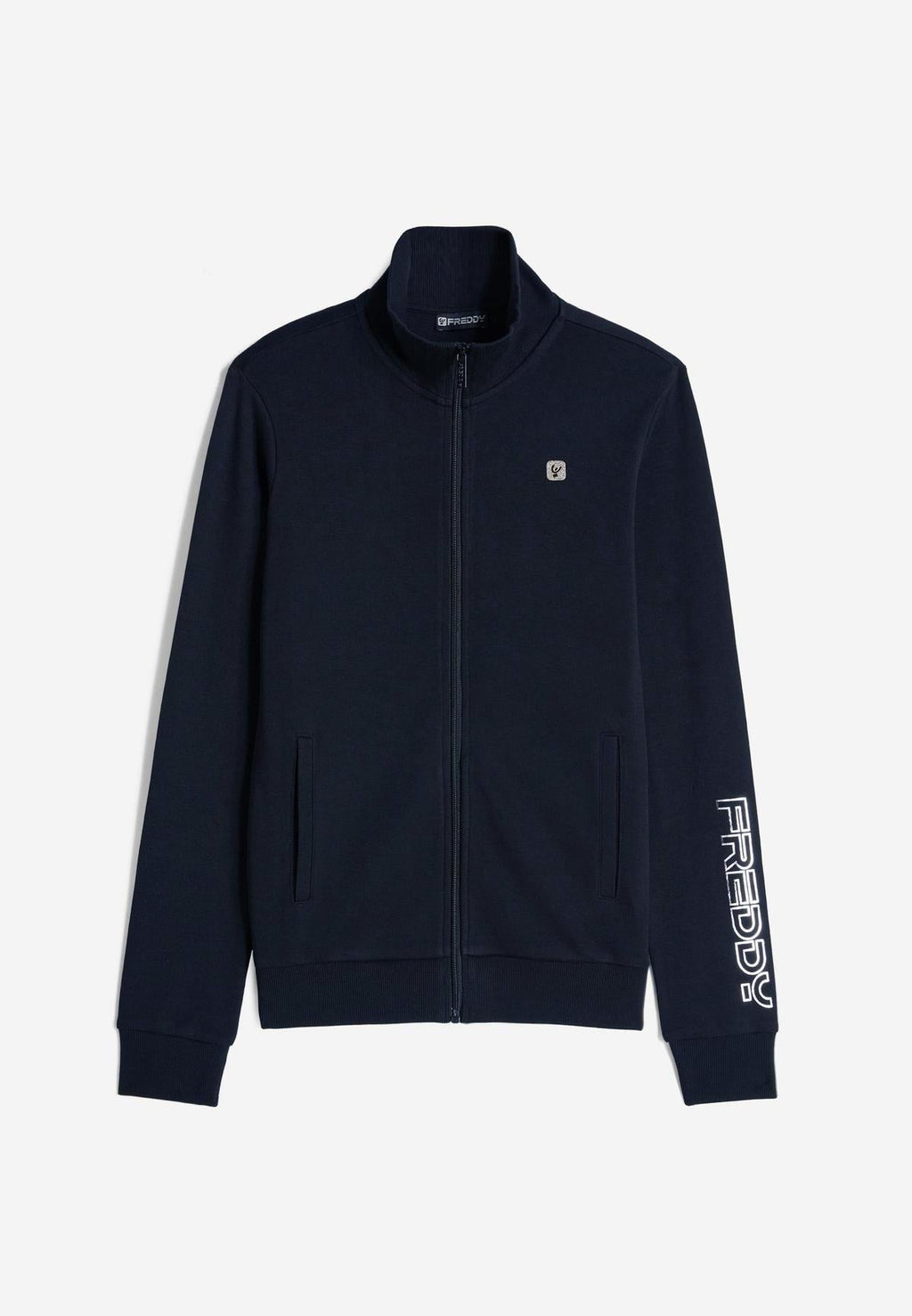 Felpa dalla vestibilità regular con chiusura a zip e collo alto in costina. Realizzata in cotone interlock, una lavorazione che dona una piacevole sensazione al contatto sulla pelle e rende il tessuto soffice e avvolgente. Ha tasche interne a filetto, fondo e polsini in costina e un piccolo logo argento lato cuore. Capo dal tono urban-sportivo caratterizzato dal stampa con logo Freddy sul fondo manica e dalla morbidezza e flessibilità del tessuto che garantisce comodità e libertà di movimento.