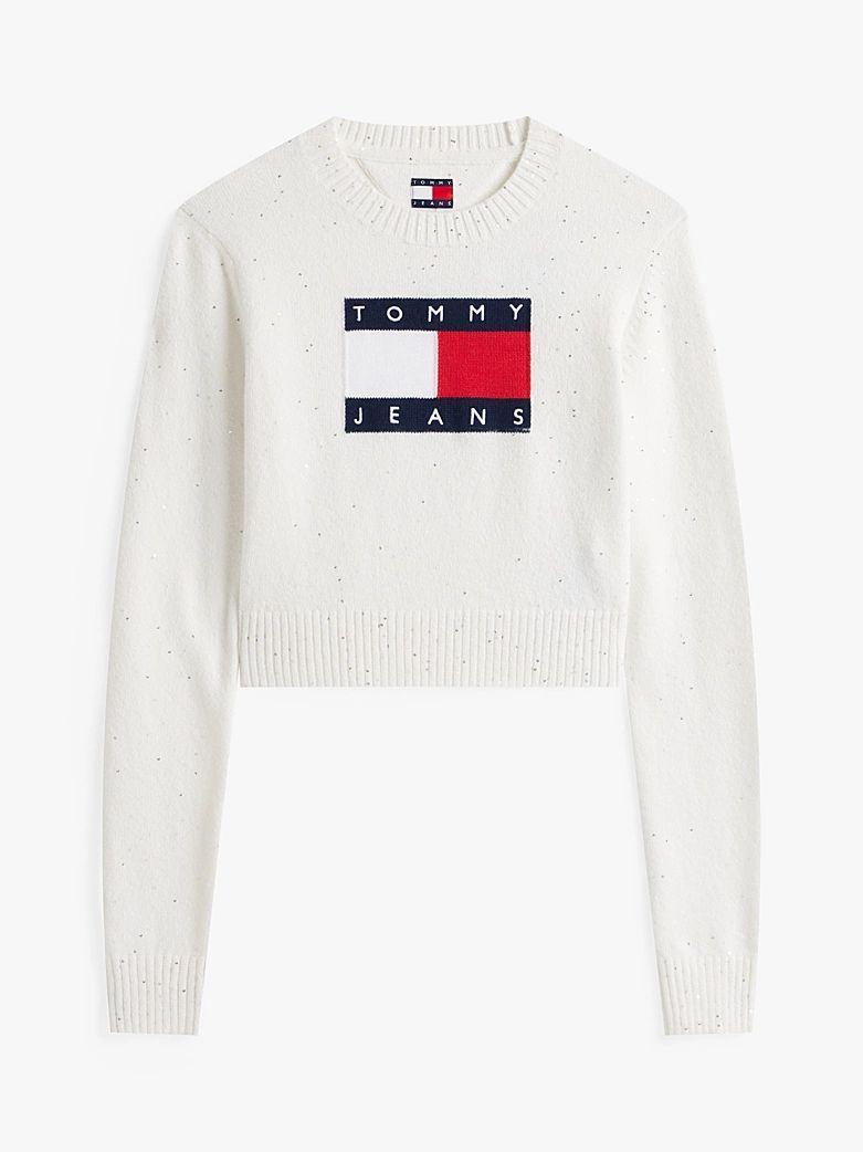 Preparati a festeggiare con stile grazie al pullover slim fit, decorato da scintillanti paillettes e completato dall'inconfondibile distintivo con bandiera Tommy.