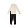 La giacca presenta un design con cappuccio regolabile e zip frontale e due tasche laterali, mentre i pantaloni sono caratterizzati da una vita elasticizzata con coulisse per una vestibilità personalizzata e due tasche anteriori. Entrambi i capi sono rifiniti con dettagli a costine su polsini e orli per garantire una calzata perfetta e mantenere il calore.