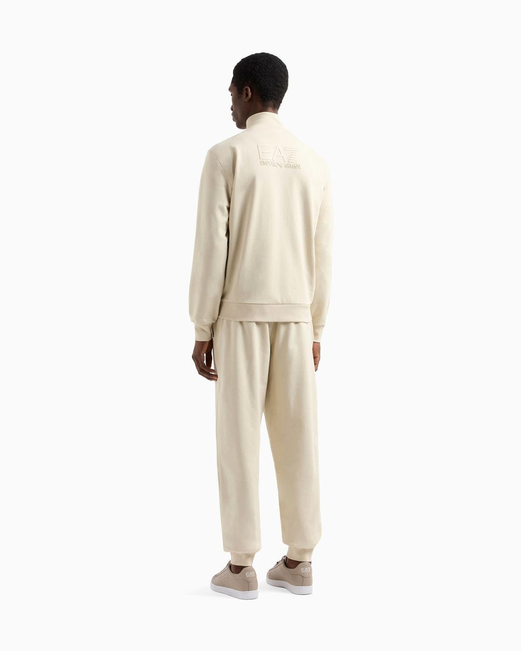 Tuta dallo spirito essenziale e confortevole, composta da una felpa con collo montante e chiusura full zip abbinata a un pantalone jogger con elastico in vita e tasche laterali. Il modello è realizzato in morbido cotone ed è personalizzato dal logo EA7 a contrasto sul retro della felpa, che rende il capo subito riconoscibile.